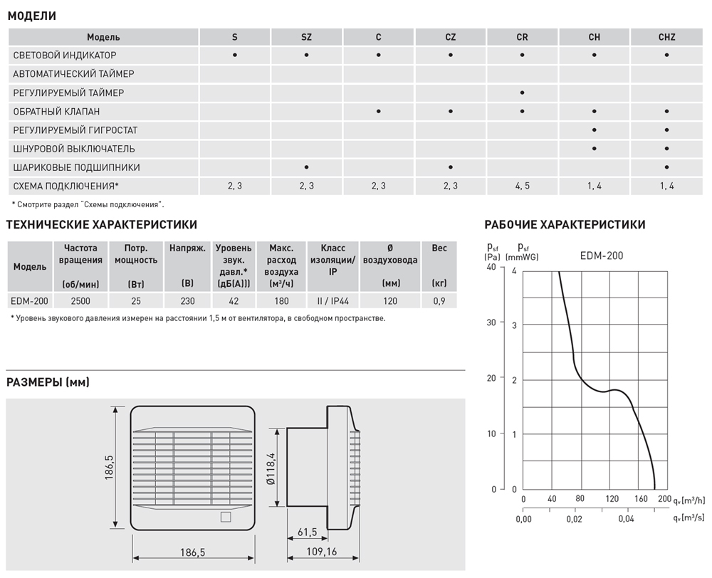 Вентиляторы EDM-200 изготавливаются из высококачественного пластика, комплектуются световым индикатором работы и однофазным электродвигателем (230В-50Гц), класс изоляции В, со встроенной термозащитой.